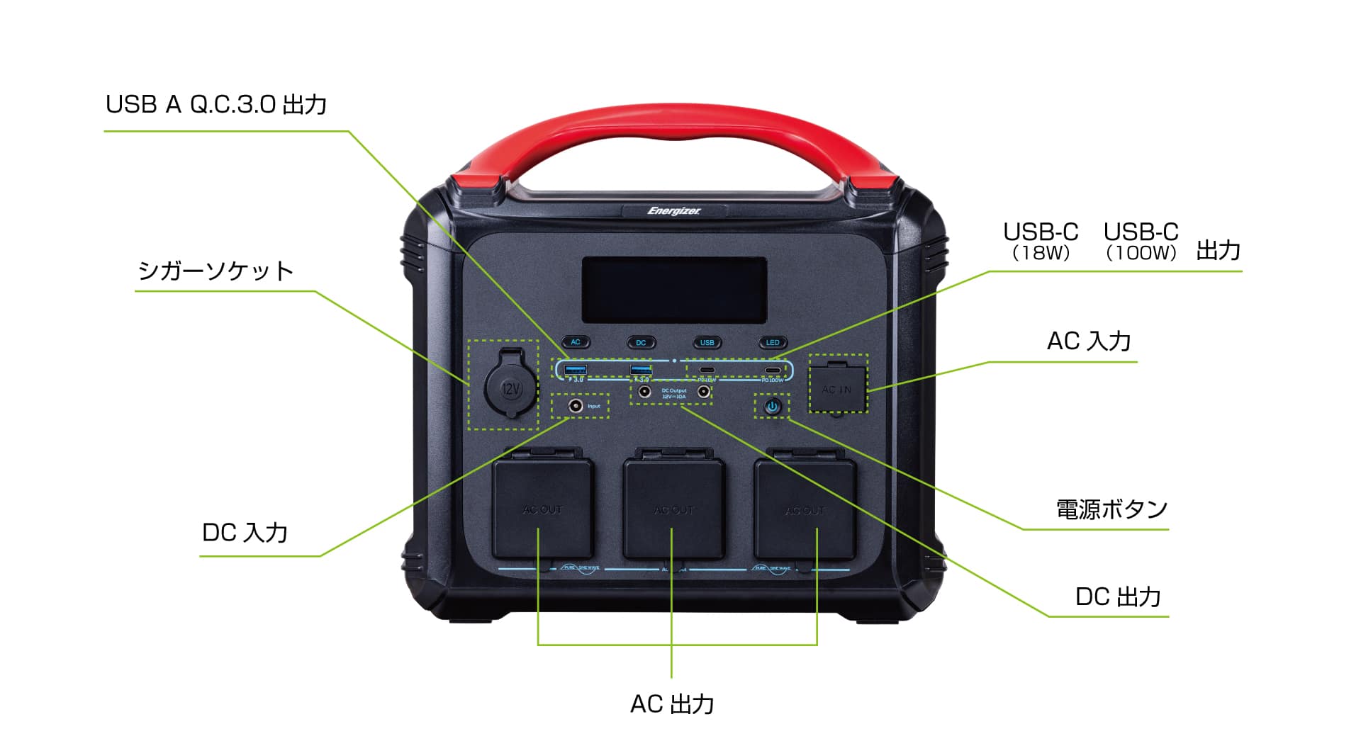 | AC出力 | AC100V(正弦波出力)×3 3ポート合計:1,200W(瞬間最大出力:2,400W) |