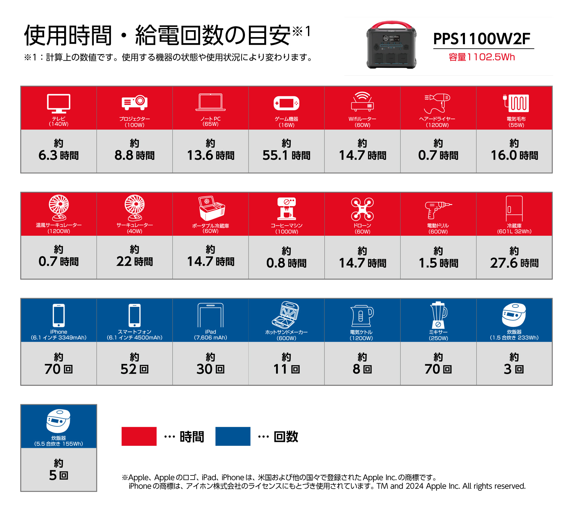 スマートフォンなら約70回 / タブレットなら約30回 / ノートPCなら約13時間。600ℓクラスの冷蔵庫なら1日以上使える1,102.5Whの大容量バッテリーを搭載