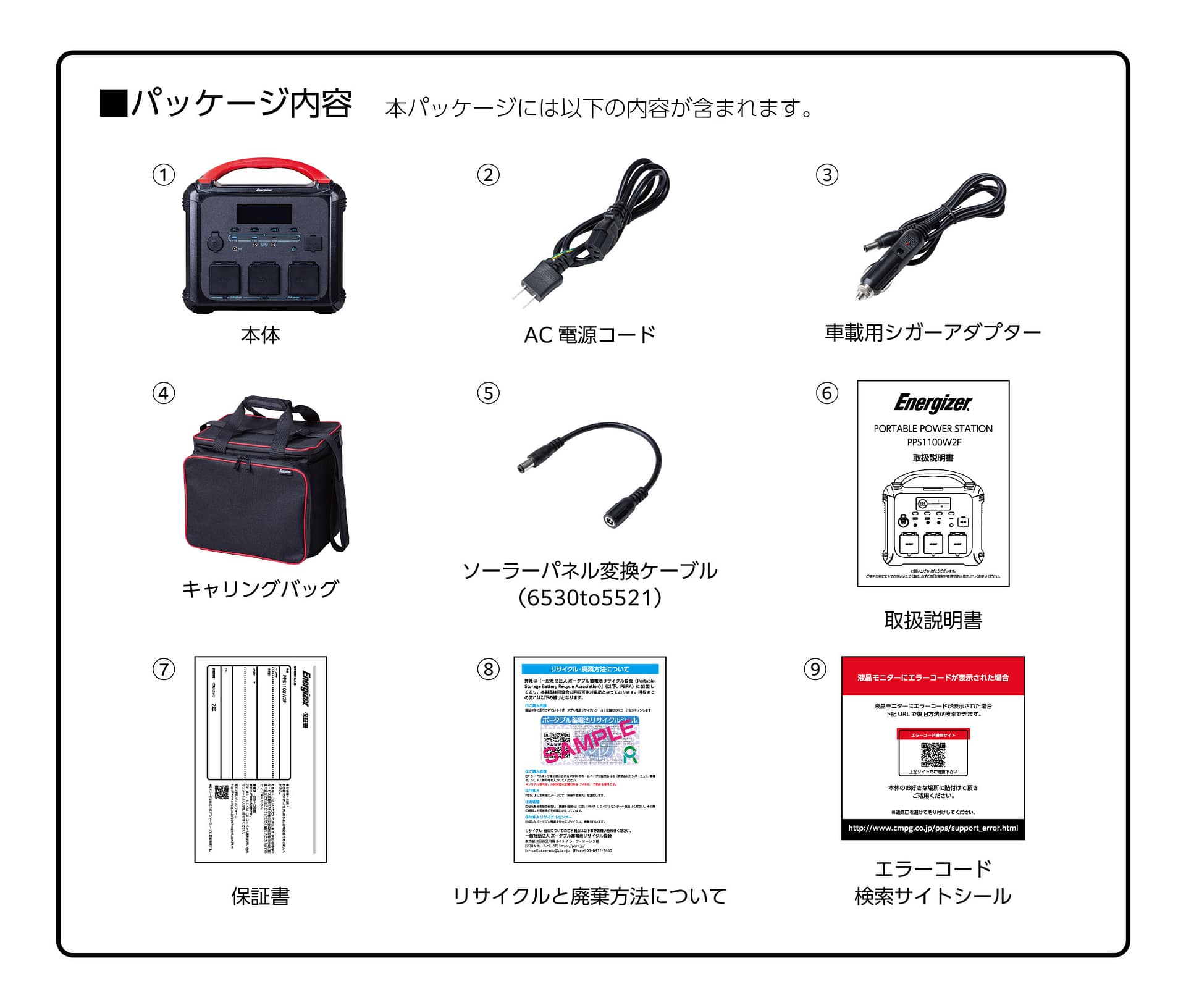| 付属品 | AC電源コード、車載用シガーアダプター、キャリングバック、ソーラーパネル変換ケーブル(6530 to 5521) |