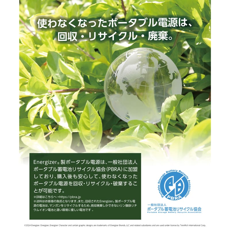 廃棄が容易でないポータブル電源、Energizer® 製ポータブル電源は、一般社団法人 ポータブル蓄電池リサイクル協会(PBRA)に加盟しており、購入後も安心して、使わなくなったポータブル電源をリサイクルすることが可能です。