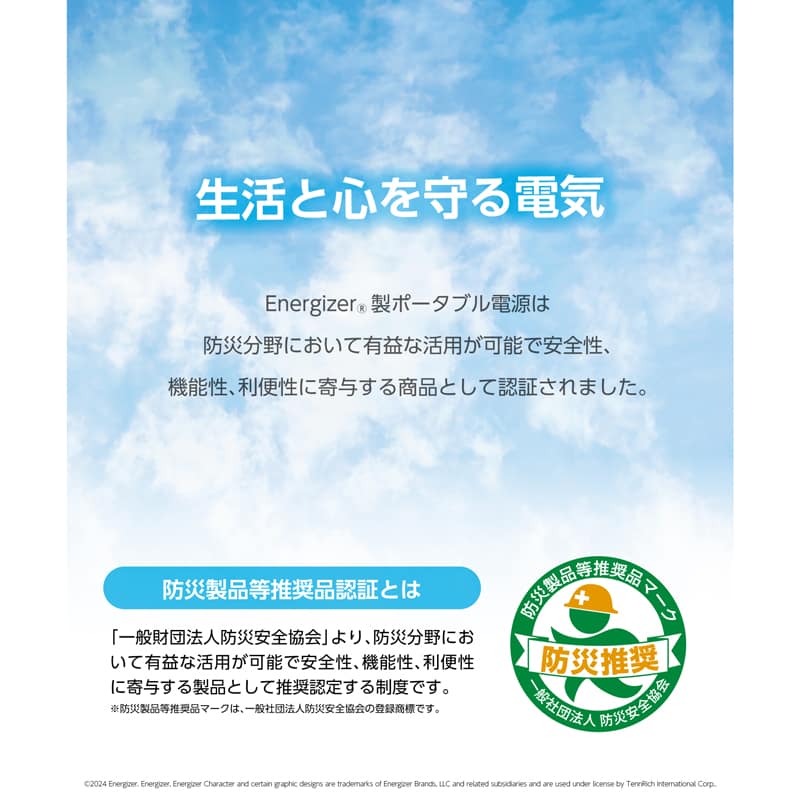 Energizer® 製ポータブル電源は防災分野において有益な活用が可能で安全性、機能性、利便性に寄与する製品として「一般社団法人防災安全協会」より認証されました。